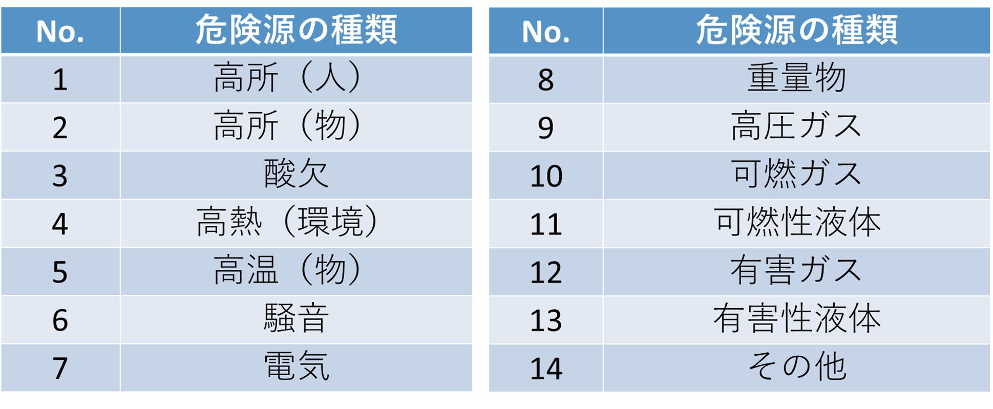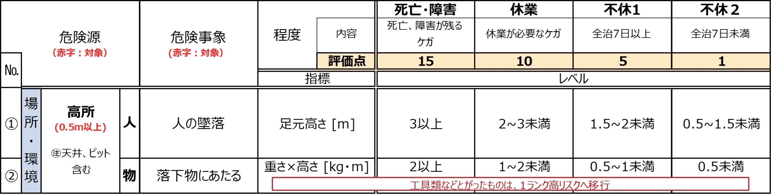 各数値は,危険源ごとに「程度」の定義を念頭に置き,過去の災害事例等からの経験・知識,法的・行政指導の数値,人への影響が公になっているものを考慮している。危険源は「作業場所や環境」「取扱う対象物」で分類し,フィールドエンジニアとの意見交換を踏まえ概ね合意した内容とした。「作業場所・環境」は7項目に分類し,それぞれ高所(人)・(物),酸欠,高温(環境)・(物),騒音,環境における有害ガスとなる。これらの評価をする場合,危険源が「高所」であれば「ケガの程度」は地面から足元の高さの数値を判断要素としている。(図1)
