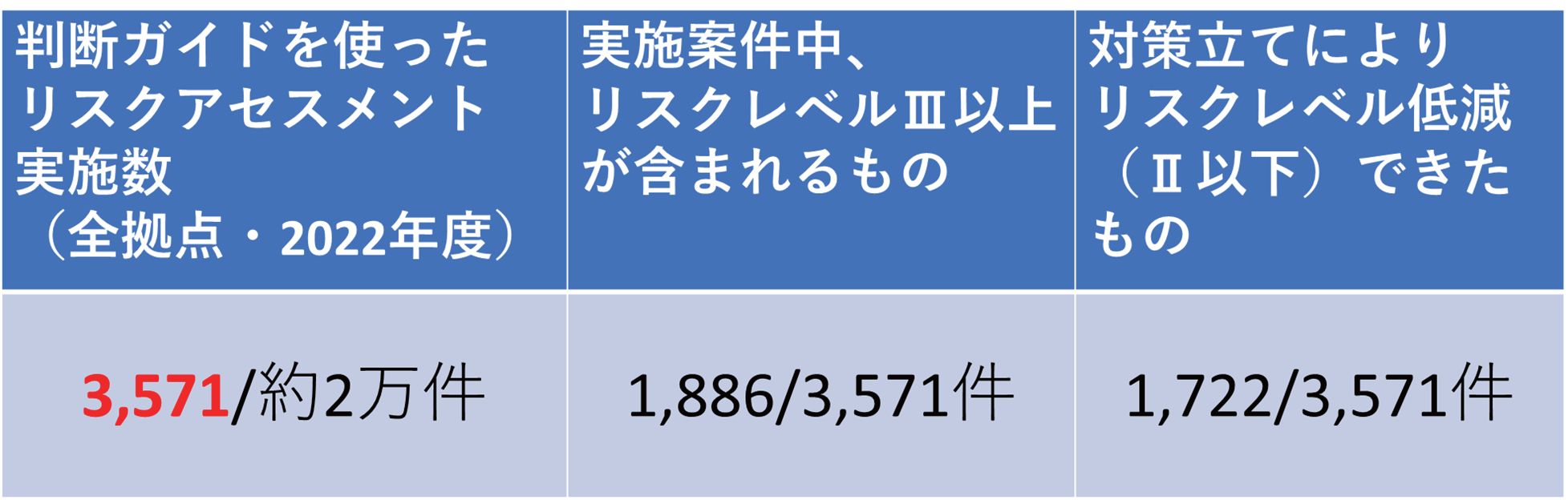 判断ガイドを用いたリスクアセスメント実施後のヒアリングの結果,運用にあたり14項目の危険源が判断ガイドにより具体的に示されたことから以前よりも現場における隠れたリスクとは何であるか,作業に関わる全ての作業者の危険源認識の向上に繋がる結果となった。リスクレベルの低減実施の効果としては表3の通りとなる。