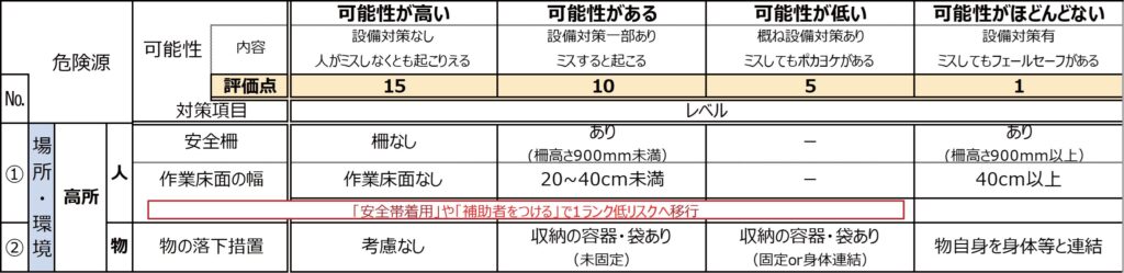 「ケガの可能性」については作業場の状況,作業方法からの視点でランク分けされている。高所においては不安全状態の定量性として作業床面の幅,手摺り等の墜落防止となる設備の有無・高さで可能性の指標とした。さらに追加対策の有無として保護具等によるランク補正を行う形となる。保護具の使用有無でリスク評価の補正は行ってはならない考え方が一般的だが,訪問作業形態である以上,当日の現場におけるリスク改善という面で保護具は重要な要素であることから,基準を満たした性能であること,使用者の知識,着用ルールを遵守した上でリスク評価補正として取り入れている。(図2)